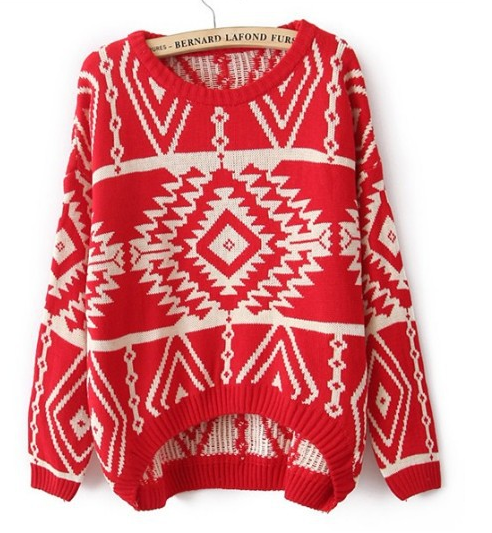 This sweater comes in one size and features bold geometric prints. Cotton.